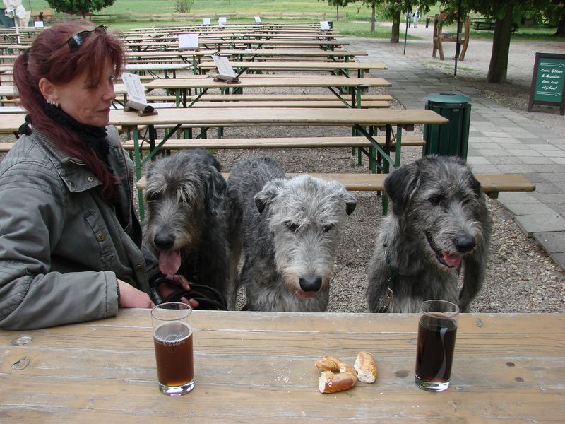 Wir sind eine Runde über das Gelände gelaufen, und wurden ganz oft gestreichelt. Ich hatte irgendwie das Gefühl das meine Mutti das genossen hat. Danach meinten meine Frauchens das sie sich auf so komische Bänke setzten mussten. Sah irgendwie unbequem aus, machte mir aber nichts ich musste da ja nicht drauf sitzen. Nebenbei konnten wir noch ein bischen Brezel abstauben, war lecker.