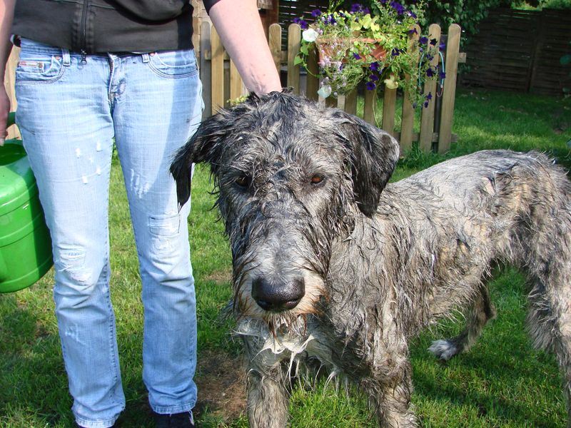 Und jetzt kommt der Hammer. Wieder zu Hause angekommen lassen meine Frauchens mich noch nicht mal auf meine Couch, sondern machen mich schon wieder nass und schäumen mich auch noch ein.
