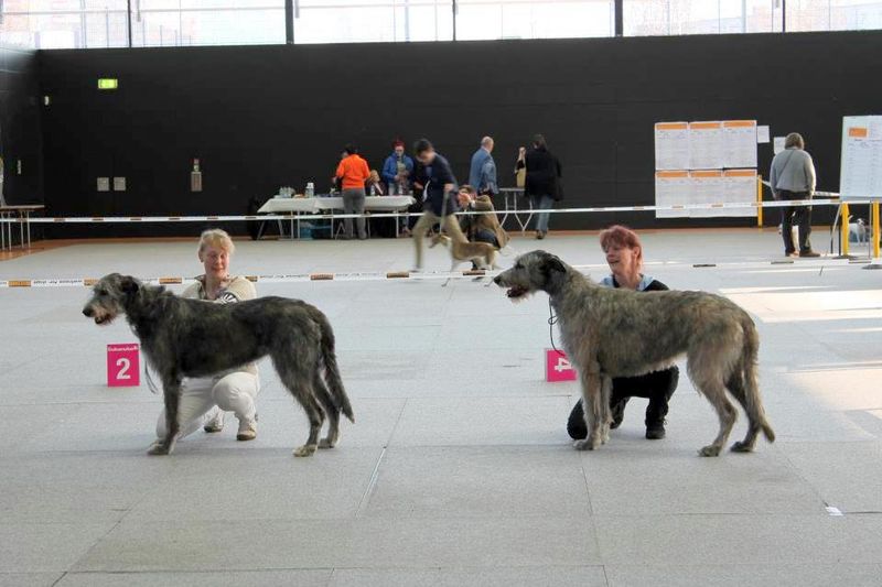 Frauchen Tina rannt auch hektisch in der Wohnung rum und packte Sachen in eine Tasche, Die hat doch was vor. Jetzt kam auch noch mein Frauchen Cori nach hause, allgemeine große Freude, aber wie jetzt, die fängt auch an zu packen??? Ach nee.....wohin wollen die denn fahren??? Ich machte es mir auf der Couch bequem und beobachtete dieses erstmal ganz entspannt. Endlich scheinen die beiden fertig zu sein, Ausstellungstasche mit dabei, aha dahin geht es also. O.k. aber wer kommt den nun mit???? Mir schwant ja fürchterliches. Ich sollte recht behalten. Ehe ich es recht begriffen hatte saß ich schon im Auto, Annabell war mit dabei, und los ging es. Gähnend langweilig so eine Autofahrt, aber am Ziel war es wieder ganz nett. Frauchen hatten ein ganzes Haus gemietet, völlig auf dem Land mit Pferde und so, für uns Stadthunde ja unvorstellbar. Ein bischen später kamen noch Freunde dazu, die kannte ich schon von meiner letzten Ausstellung. Am nächsten Tag dann nun die Ausstellung. Ich musste mit Frauchen Cori in den Ring, was soll ich sagen.... Wir haben gewonnen. Frauchen Tina und Annabell standen mit sieben weiteren Hündinen im Ring, was soll ich da sagen... Die beiden haben auch gewonnen. Danach mussten Annabell und ich gemeinsam in den Ring und um die beste Hündin laufen. ICH HABE GEWONNEN. * Freu * Unsere beiden Frauchens waren völlig aus dem Häuschen. Menschen.....